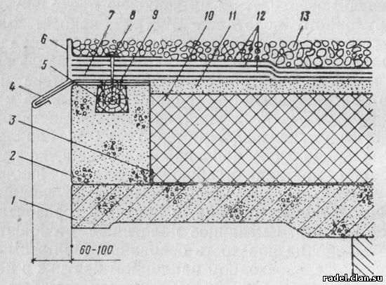 Рис. 14. Укладка и наклейка рулонного ковра на покрытие с неорганизованным водосбросом 1 — несущая плита; 2 — карнизный блок; 3 — пароизоляционный слой; 4 — костыль 4Х50 мм; 5 — антисептированная березовая пробка 50Х70Х70 мм (через 150 мм); 6 — фартук из оцинкованной стали толщиной 0,6 мм; 7 — дополнительное рулонное полотнище; 8 — шуруп 5Х40 мм с полукруглой головкой; 9 — шуруп 4Х30 мм с потайной головкой; 10 — теплоизоляционный слой: 11 — стяжка; 12 — рулонный кровельный ковер; 13 — защитный слой из гравия Костыли 4 крепят шурупами, а не гвоздями. Наклеив дополнительное полотнище 7, остальные слои рулонного ковра 12 хорошо приклеивают и укатывают катком. Чтобы не завернуть шуруп мимо пробки, до установки костылей на стене делают меловые риски, указывающие расположение пробок 5. Для предохранения от повреждений рулонный ковер защищают фартуком 6 из оцинкованной стали, который своей сливной кромкой должен плотно охватывать концы костылей. Горизонтальный отворот фартука укладывают на мастике и крепят шурупами вместе с рулонным ковром. Далее, на ковер наносят слой мастики и рассыпают по ней мелкий гравий, образуя защитный слой кровли. Для оклейки к о н и ч е с к и х в ы с т у п о в различны деталей покрытия (крыши) заготовляют полотнища по выкройке, приведенной на рис. 15.