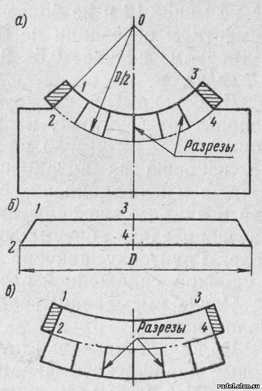 Рис. 15. Покрытие конического выступа основания шахты, стойки и других элементов а и в — заготовки полотнищ для укладки на коническом выступе (на 1/4 его части) и на плоскости (заштрихованные края-кромки для образования нахлесток при сопряжении полотнищ во время укладки; величина нахлестки определяется по месту); б — сечение конического выступа с диаметром D у основания; 1—4 — точки для построения заготовки Вначале наклеивают полотнища, выкроенные по рис. 15,а, причем трапецеидальные «языки» располагают на коническом выступ а остальную часть полотнища — на основании кровли. Второй слой выполняют из полотнищ, заготовленных по рис. 15,б. Верхние части этих полотнищ должны перекрывать ранее наклеенные «языки» на конической части. «Языки» же полотнищ второго слоя наклеивают на основание кровли, тщательно обжимают руками в рукавицах все слои наклеиваемого материала и прошпаклевывают кромки выступившей мастикой. Перед наклейкой рулонного ковра на скатах покрытия основание очищают от строительного мусора, просушивают и обеспыливают. Сильно запыленные участки покрытия большой площади рекомендуется обдувать сжатым воздухом, подаваемым с наветренной стороны по резиновому шлангу от компрессора. С небольших крыш можно сметать пыль метлами. Влажные основания сушат естественным путем. Если необходимо ускорить этот процесс, для сушки применяют переносные калориферы или огневые воздухоподогреватели ОВЖТ-50, работающие на жидком топливе. На поверхность, подлежащую сушке, укладывают кирпичи на ребро, а по ним — листы сухой штукатурки или какой-либо другой материал, например фанеру, древесноволокнистые плиты, рулонные полотнища и т. п. В образовавшуюся под таким укрытием полость подают подогретый воздух до тех пор, пока основание не высохнет. Степень просушки поверхности основания проверяют пробной наклейкой рулонного полотнища площадью около 1 м2 горячей мастикой. После затвердевания мастики полотнище отрывают; если при этом мастика не отстает от основания, а разрывы происходят по картону, то основание считают сухим. Проверка влажности основания обязательна при выполнении работ после росы, тумана н других атмосферных осадков. Очищенное и просушенное основание под рулонную кровлю должно быть покрыто холодной грунтовкой. Огрунтовку производят, как правило, по свежеуложенной цементной стяжке (в процессе схватывания цемента). Если это не было сделано, огрунтовывают отвердевшее основание. Время нанесения грунтовки определяет построечная лаборатория. Время высыхания должно составлять: грунтовок на свежеуложенной цементной стяжке не менее 12 и не более 48 ч; грунтовок на созревшем цементном основании не более 10 ч. Расход грунтовки в первом случае 0,5 — 0,7 кг/м2, во втором — окол 0,2 кг/м2. Для покрытия свежеуложенной цементной стяжки используют грунтовку на медленно испаряющихся растворителях — битумную на соляровом масле или керосине, пековую на антраценовом масле. Для созревше стяжки и оснований из сборных железобетонных панелей и плит можно применять грунтовку на легколетучих растворителях — битумную на бензине, пековую на бензоле. Грунтовку наносят на основание краскопультом с удочкой, снабженной разбрызгивающим наконечником. После высыхания грунтовки наклеивают рулонные полотнища. До начала наклейки натянутым шнуром отбива