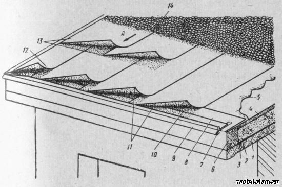 Рис. 16. Укладка двухслойного рулонного ковра на совмещенное покрытие с уклоном более 15% 1 — несущая плита; 2 — теплоизоляционный слой; 3 — пароизоляционный слой; 4 — стяжка; 5 — огрунтовка стяжки; 6 — карнизный блок; 7 — костыли 4Х50 мм (через 600 мм); 8 — дополнительное рулонное полотнище на карнизах и фронтонах; 9 — карнизный фартук; 10 — мастика; 11 — рулонные полотнища первого слоя; 12 — уравнительное полотнище первого слоя; 13 — рулонные полотнища второго слоя; 14 — защитный слой из гравия. Стрелкой А показано направление стока воды Подготовив основание на карнизных и фронтонных свесах, устанавливают костыли 7 и наклеивают дополнительные полотнища 8. На костылях закрепляют карнизные фартуки 9, горизонтальные отвороты которых прибивают гвоздями 4Х50 мм к закладным пробкам на свесах через 600 мм. Более надежно крепление фартуков к карнизным или фронтонным доском либо к брускам, уложенным на сливных краях карнизных 6 и фронтонных блоков. Крепление фартуков 9 производят по рис. 18,а. Заготовки фартуков соединяют между собой внахлестку (на 150 мм). Вслед за этим приступают к наклейке рядовых рулонных полотнищ 11 первого слоя кровельного ковра. Уравнительно полотнище 12 наклеивают таким образом, чтобы его продольная кромка вплотную примыкала к фальцу фронтонного фартука. Второй (наружный) слой рулонного ковра должен быть из полномерных полотнищ 13, которые наклеивают, в направлении справа налево. Последнее полотнище укладывают прямо на уравнительное и продольной кромкой впритык к фальцу фронтонного фартука. В это случае разбежка продольных швов получается равной половине ширины рулона. Закончив наклейку рулонного ковра, фартучные бутики высотой 20 мм сваливают на его плоскость и таким образом закрепляют сливную кромку ковра, чтобы избежать ее отрыва веером. Поскольку такие буртики устраивают с наклоном 60o, сваливание их на рулонный ковер не представляет особых трудностей: эту операцию выполняют при помощи деревянного бруска. Если буртики имеют высоту 8 — 10 мм, сваливать их нет необходимости; в этом случае нужно только следить, чтобы края рулонной кровли плотнее примыкали к буртикам. В процессе наклейки рулонного полотнища щеточник должен передвигаться впереди (немного сбоку) раскатываемого рулона, нанося щеткой мастику вначале на края полотнища двумя продольными мазками (на участки длиной до 0,7 м), а затем между ними поперечными мазками на основание. При наклейке рулонное полотнище может отклониться в сторону. Чтобы выправить его положение, необходимо увеличить нажим на тот край рулона, который отклоняется. Если это не помогает, укладчик должен отрезать приклеиваемое полотнище от рулона, уложить и приклеить его правильно. Обрезанный конец накладывают на наклеенный с нахлесткой 100 мм, смазывают мастикой, прошпаклевывают и продолжают наклейку в прежнем направлении. Воздушные мешки и вздутия устраняются укладчиком, как описано ранее. Наклейка «с колена» сильно утомляет рабочего. Поэтому для выполнения данного процесса следует пользоваться катком-раскатчиком (рис. 17), позволяющим кровельщикам работать стоя.
