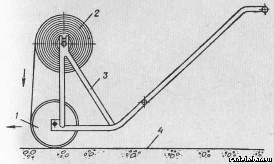 Рис. 17. Каток-раскатчик для наклейки рулонных материалов 1 — пригкимной каток; 2 — полотнище, свернутое в рулон; 3 — трубчатая рама раскатчика; 4 — рулонное полотнище, приклеенное к основанию Для получения защитного слоя на готовый рулонный ковер черпаками разливают горячую мастику и разравнивают ее гребками до получения слоя толщиной 2 мм. В неостывшую мастику из передвижного бункера или совковой лопатой разбрасывают гравий фракции 3 — 15 мм, подогретый до температуры 90 — 100 oС. После остывания мастики избыток гравийной посыпки сметают. Затем таким же образом получают второй защитный слой из гравия. При наклейке рулонного материала в ветреную погоду направление движения выбирают по ветру, что исключает попадание горячих капель мастики, на укладчика. Чтобы ветер не отрывал полотнища наружного слоя, а также не заносил в продольные нахлестки кровельного ковра пыль и снег, швы на скатах крыши располагают по направлению господствующих ветров. На рис. 18 показана укладка трехслойной рулонной кровли на совмещенное покрытие с уклоном менее 15%.